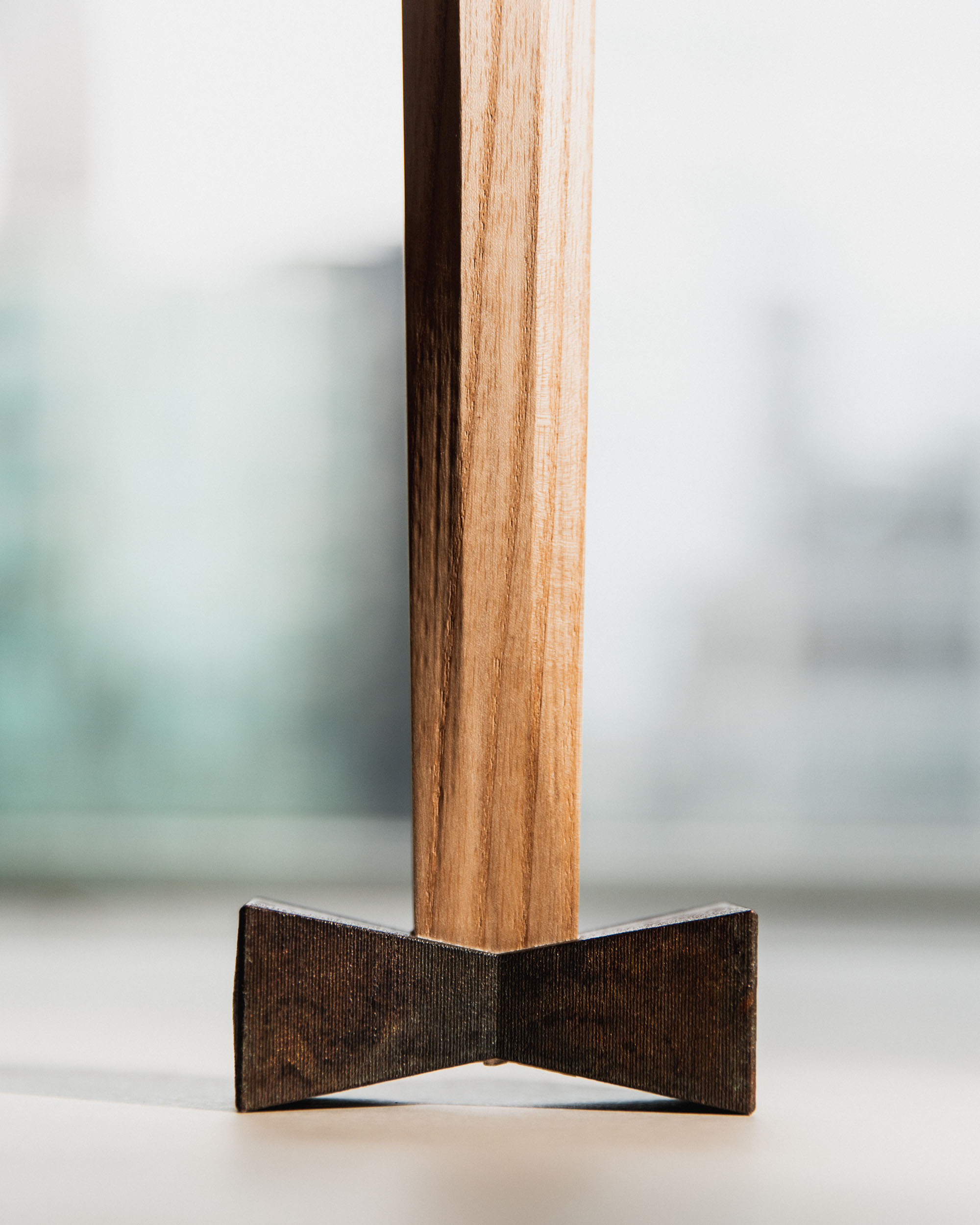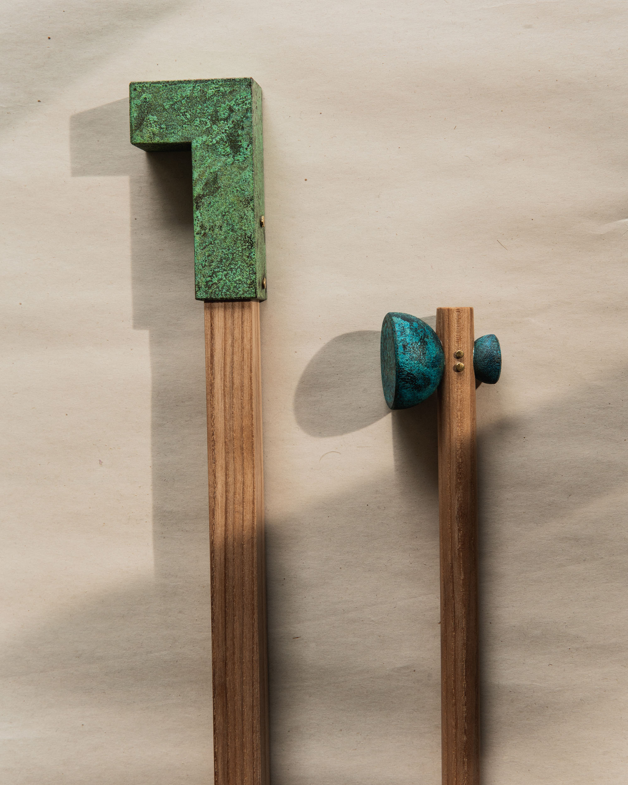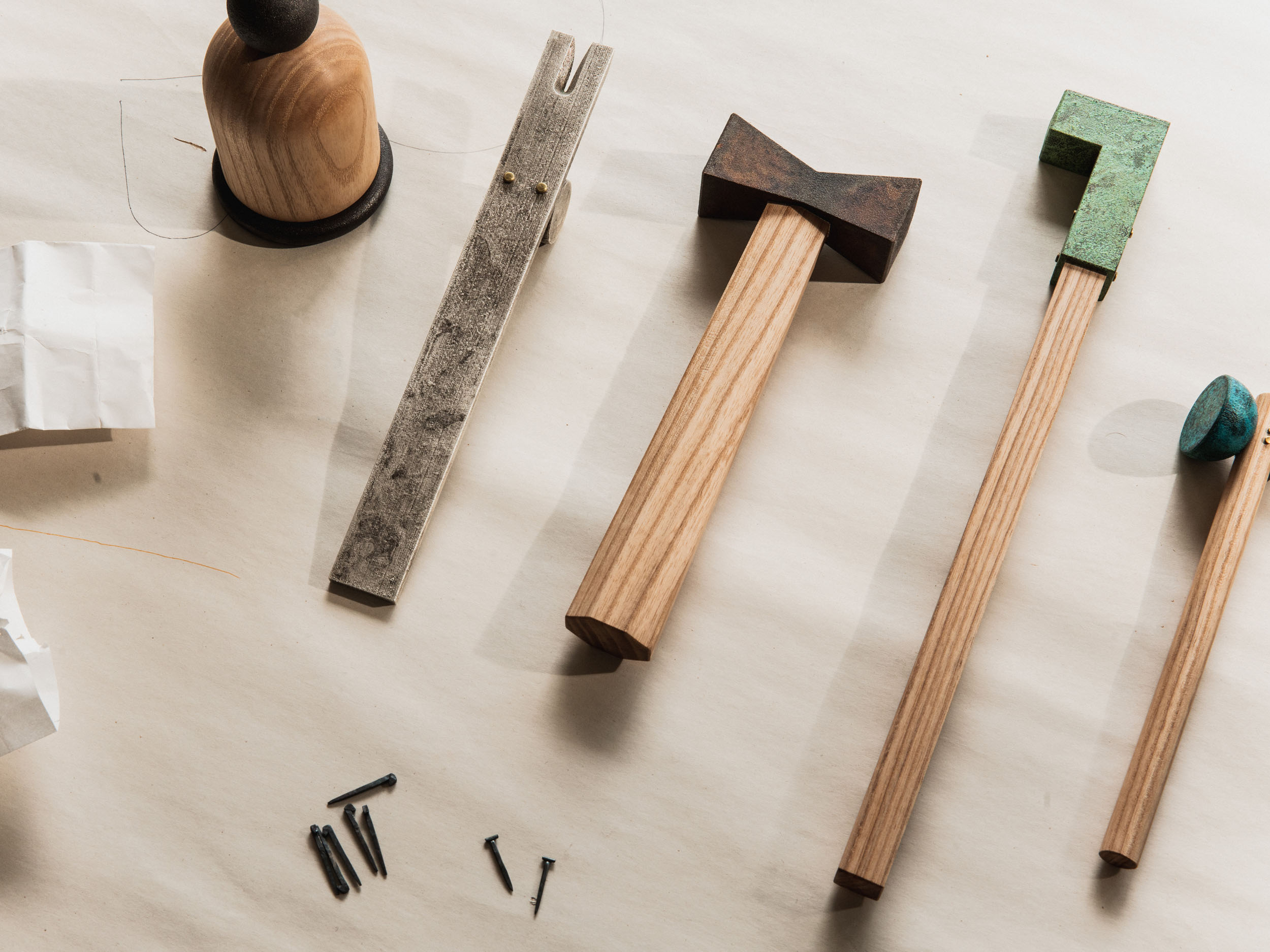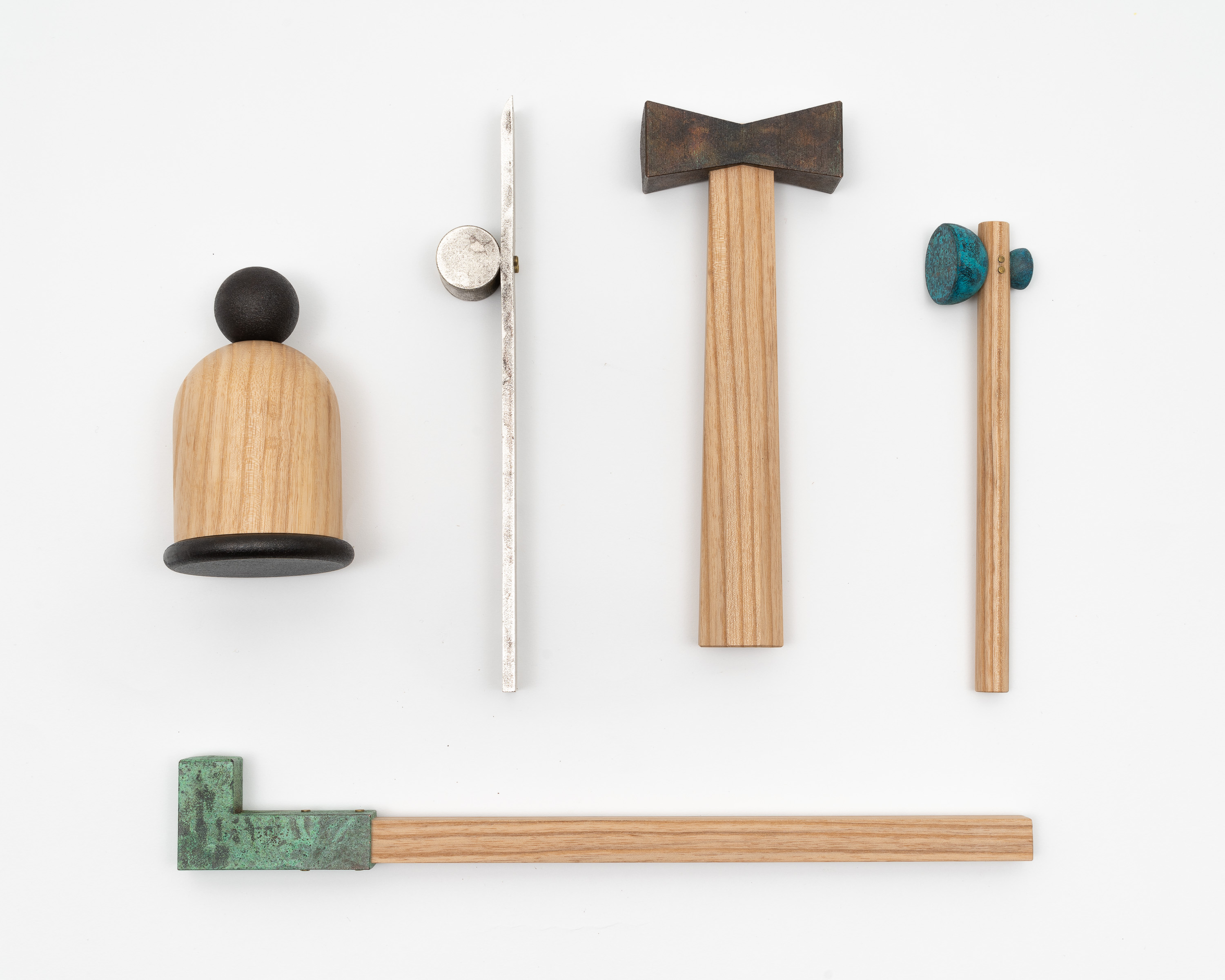 This collection of hammers is a formal and phonetic interpretation of the hammer. The title for each derives from Japanese onomatopoeia which reveals the subtle, Japanese sensitivity to material properties. The hammerheads were 3D printed in steel and then patinated with traditional colors by master craftsmen in Kyoto, Japan.