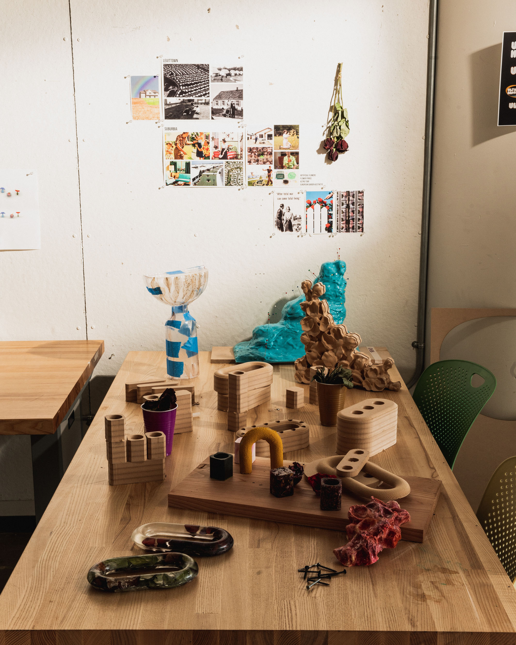 The utopian principle of maintaining order is exemplified in the ideals of the American suburb. The first such community, Levittown, was built in Long Island, New York just after World War II as an attempt to meet the housing needs of a growing middle class. Abraham Levitt, co-creator of Levittown, established strict standards to achieve a level of uniformity and in his mind, perfection, to which the community must abide. Levitt believed that “grass was the foundation of life” and that it should be meticulously maintained to achieve “neighborhood stabilization.” With this in mind, residents used manicured rolls of sod and plastic substitutions to tame their landscapes. The front yard became a manifestation of Levitts’s utopia where color and uniformity were everlasting. Inspired by the subjugation of nature in Levittown, Perennial is a series of vases that encapsulate fresh flowers within resin, rendering their bloom eternal.