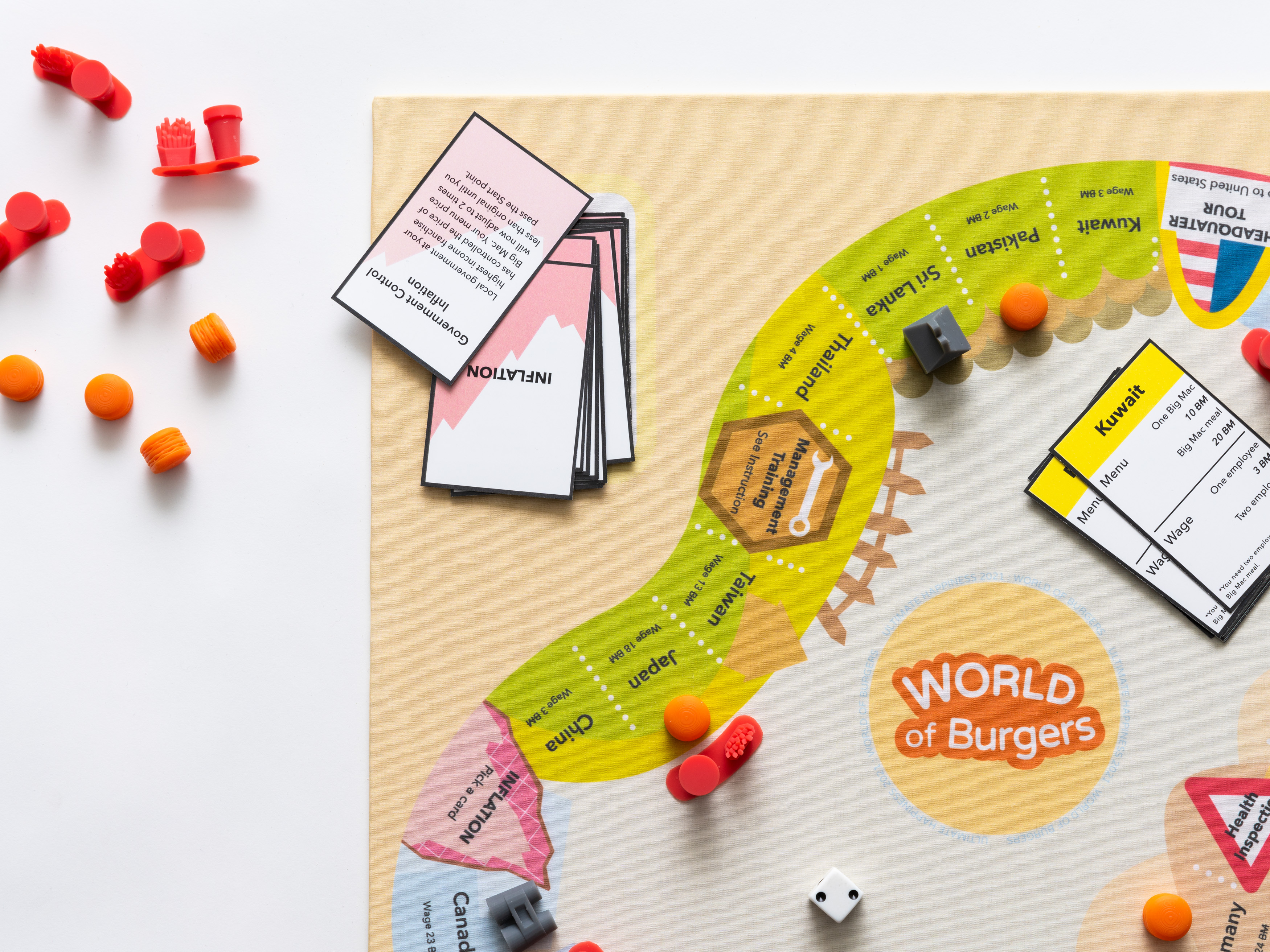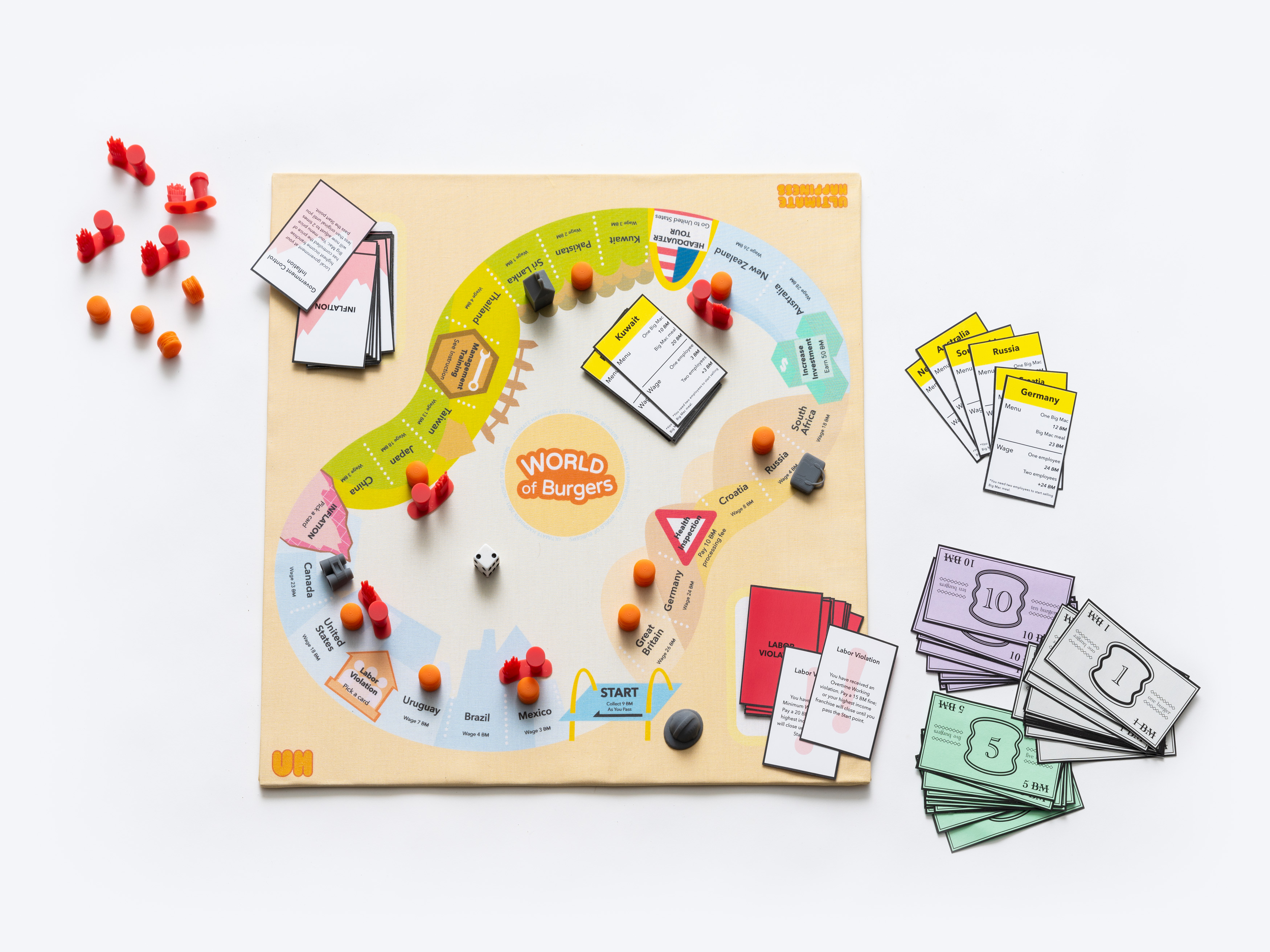 World of Burgers (WOB) is a board game in which players navigate forces of global labor and macroeconomics using the infamous Big Mac. Inspired by global minimum wage policies and burgernomics–which uses the Big Mac as a price benchmark to illustrate the concept of purchasing power parity–WOB takes cues from Monopoly and places restrictions on players based on real–world concepts like economic inflation and labor violations. A player can win the game by understanding different relationships between labor and time, as determined by the conditions created by globalization.