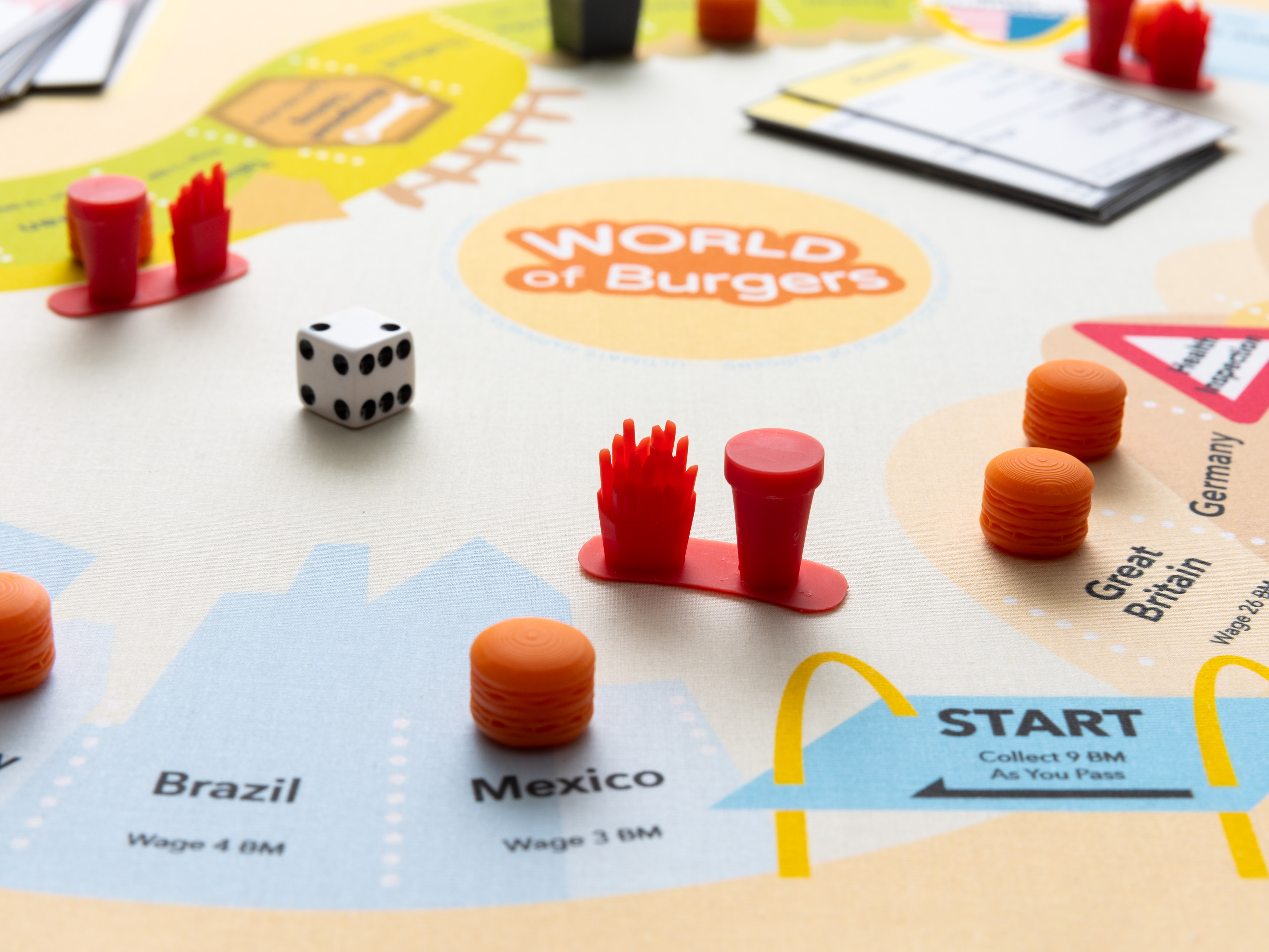 World of Burgers (WOB) is a board game in which players navigate forces of global labor and macroeconomics using the infamous Big Mac. Inspired by global minimum wage policies and burgernomics–which uses the Big Mac as a price benchmark to illustrate the concept of purchasing power parity–WOB takes cues from Monopoly and places restrictions on players based on real–world concepts like economic inflation and labor violations. A player can win the game by understanding different relationships between labor and time, as determined by the conditions created by globalization.